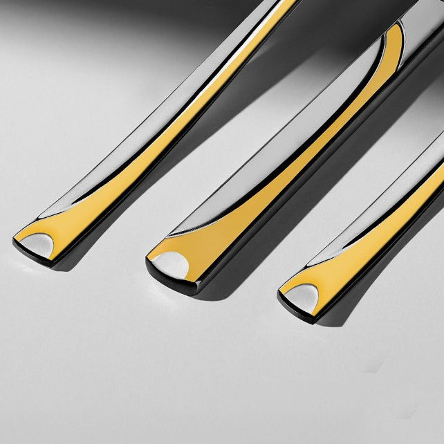 مجموعة أدوات المائدة FIESTA Gold Sandblast المكونة من 89 قطعة مصنوعة بتقنية إنتاج Monoblock ومزينة بتطريز بسيط. نظرًا لأنها مصنوعة من الفولاذ المقاوم للصدأ من الدرجة الأولى 18/10 بدون لحام، فهي متينة للغاية وناعمة. تحصل على لمعانها وسطوعها من التآكل الطبيعي للفولاذ الخالص ولا يتم تطبيق تقنية طلاء إضافية. يتم صقل الشوكات مرتين وإعادتها إلى أنعم حالاتها لسهولة الاستخدام ولمنع بقايا الزيت والبكتيريا والأوساخ.أبعاد المنتج: